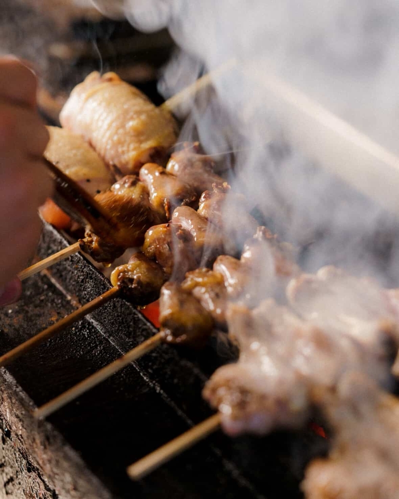 立ちのぼる香りとともに供される、熱々の炭火焼きの串。